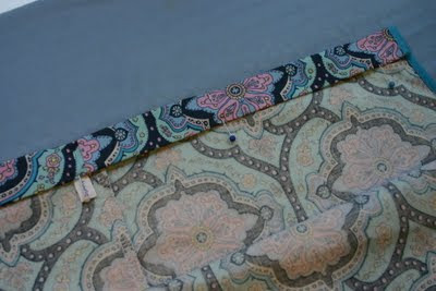 Doble la tela dobladillo a la mitad, revés de ambos lados (44 "borde a juego con los otros 44" del borde) y el hierro. Abre la impresión principal y el pin de la tela dobladillo en la parte inferior (44 "borde), para crear el borde. Se le fijación a través de tres capas (el dobladillo y el tejido principal).