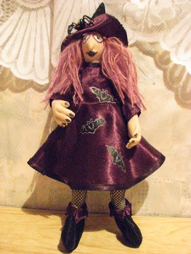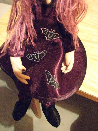 - Uñas y labios pintados.- Los ojazos están pintados con acrílicos directamente sobre la tela de la cara. Los párpados se recortan de un retal ligeramente coloreado (en este caso combinado con el morado del pelo y la vestimenta) y se pegan encima de los ojos. Luego se bordean con hilo a juego.